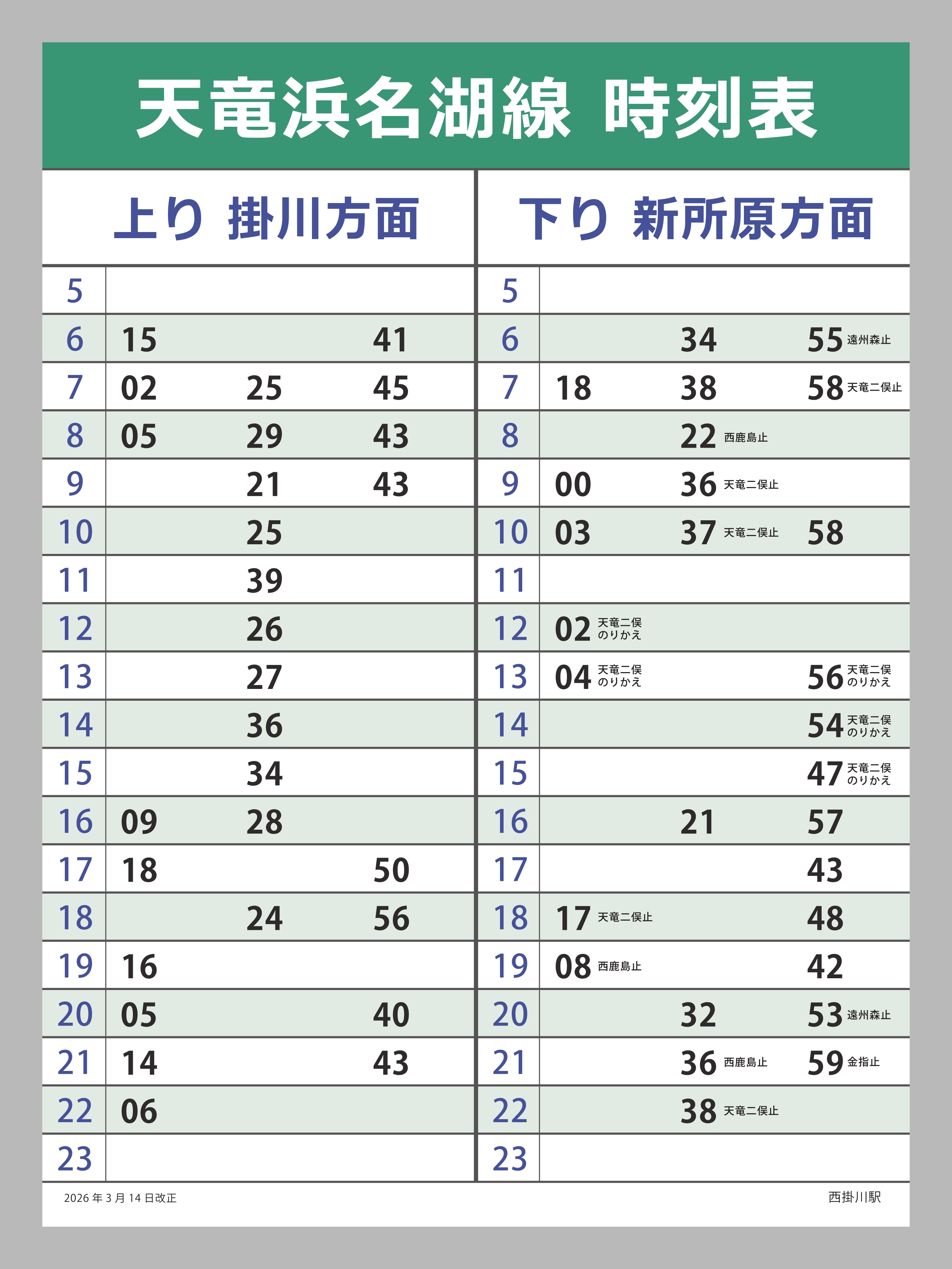 駅前には子育て支援センター「つくしなかよし広場」、スイミングスクールなどがあり、子供達の笑い声で賑わっています。掛川という地名は、市内東側を流れる逆川の崖がよく欠け落ちるので、「欠け川」→「掛川」になったと言われています。歌川広重の東海道53次で描かれている掛川は当駅から5分、ここから東海道と秋葉街道が分かれ、以前はここに一の鳥居が立てられており、現在は秋葉神社遥拝所があります。近くにはショッピングセンター、ホームセンター、スーパーマーケット、衣料品店、家電量販店など様々な店舗があり便利な土地柄となっています。