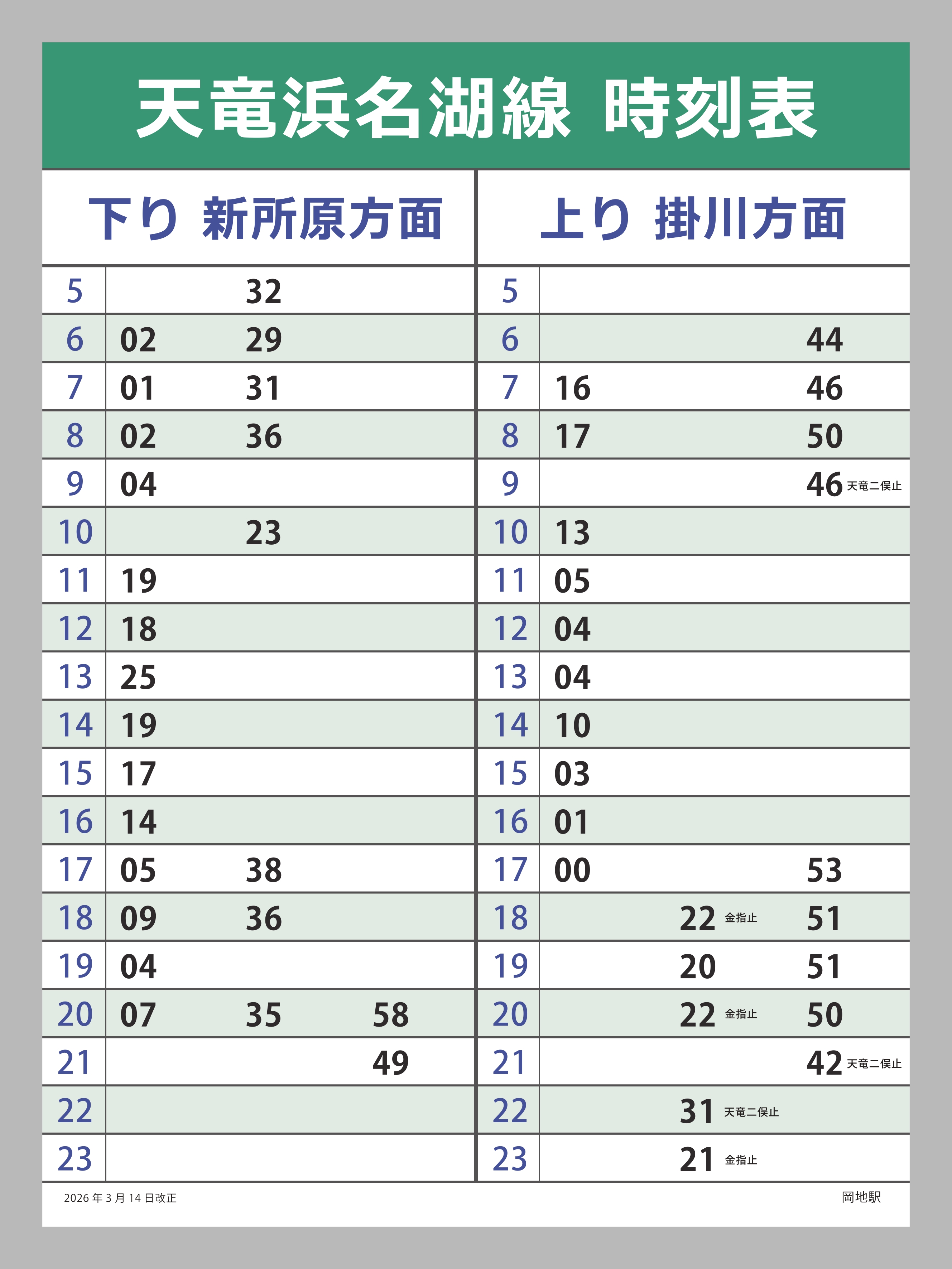 平成27年3月に『気賀高校前駅』から『岡地駅』に名称変更いたしました。
