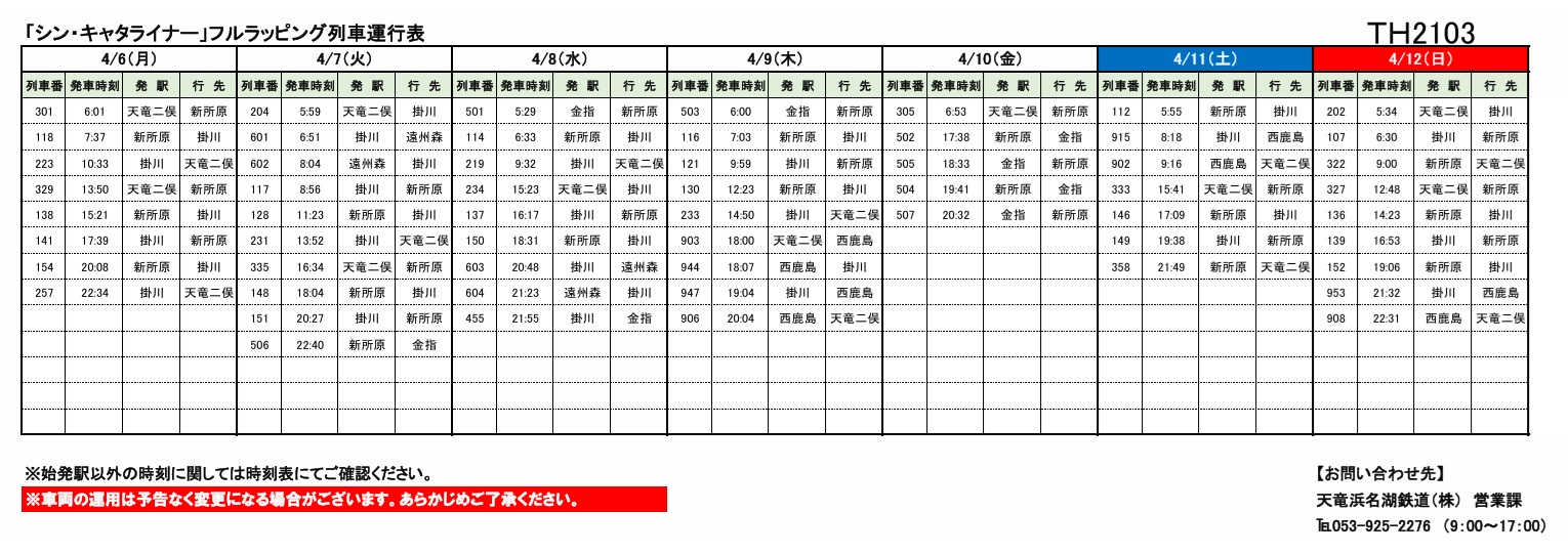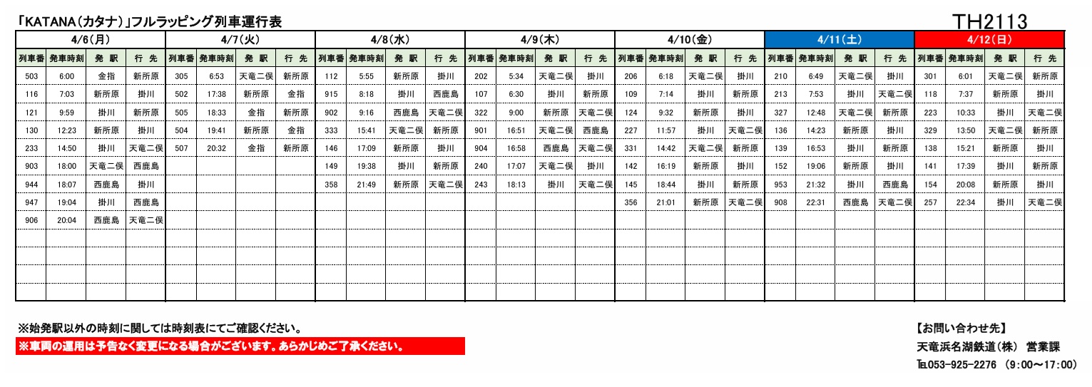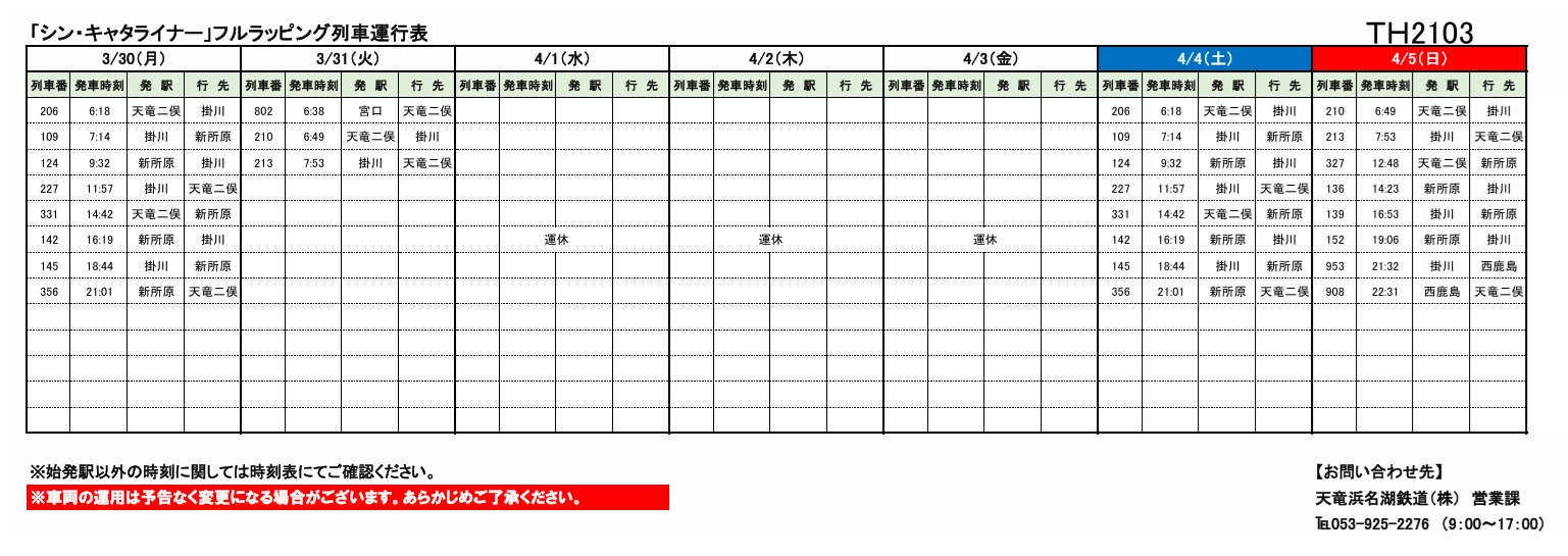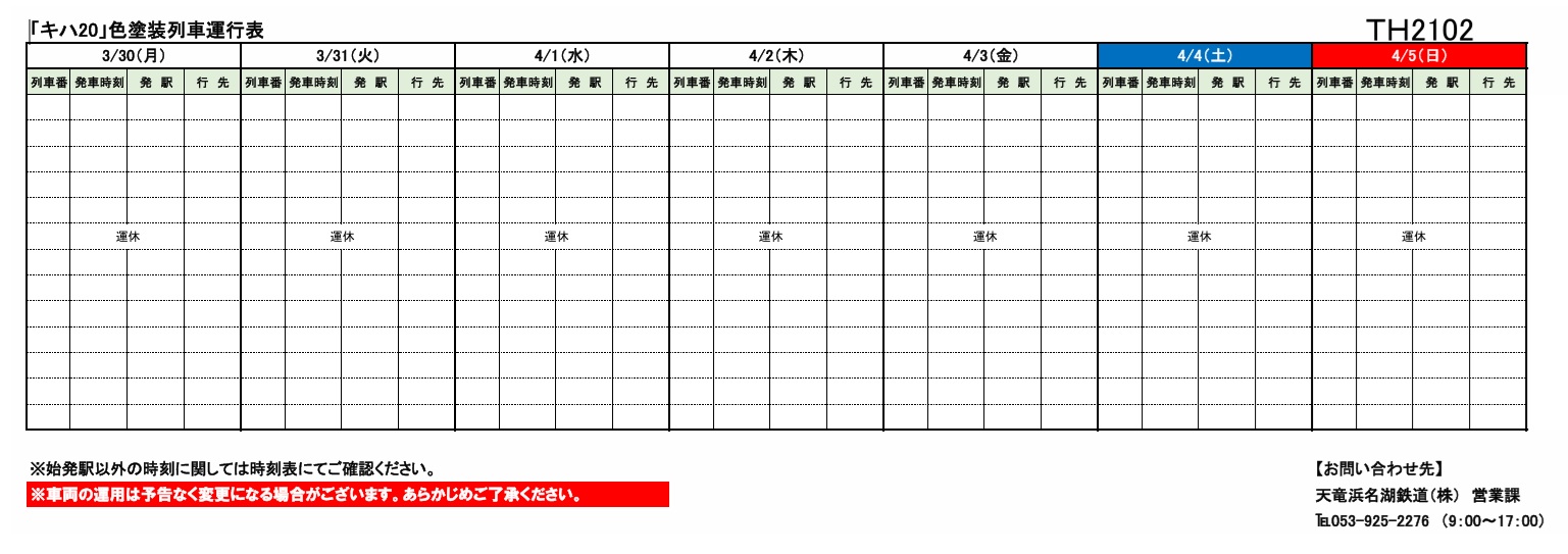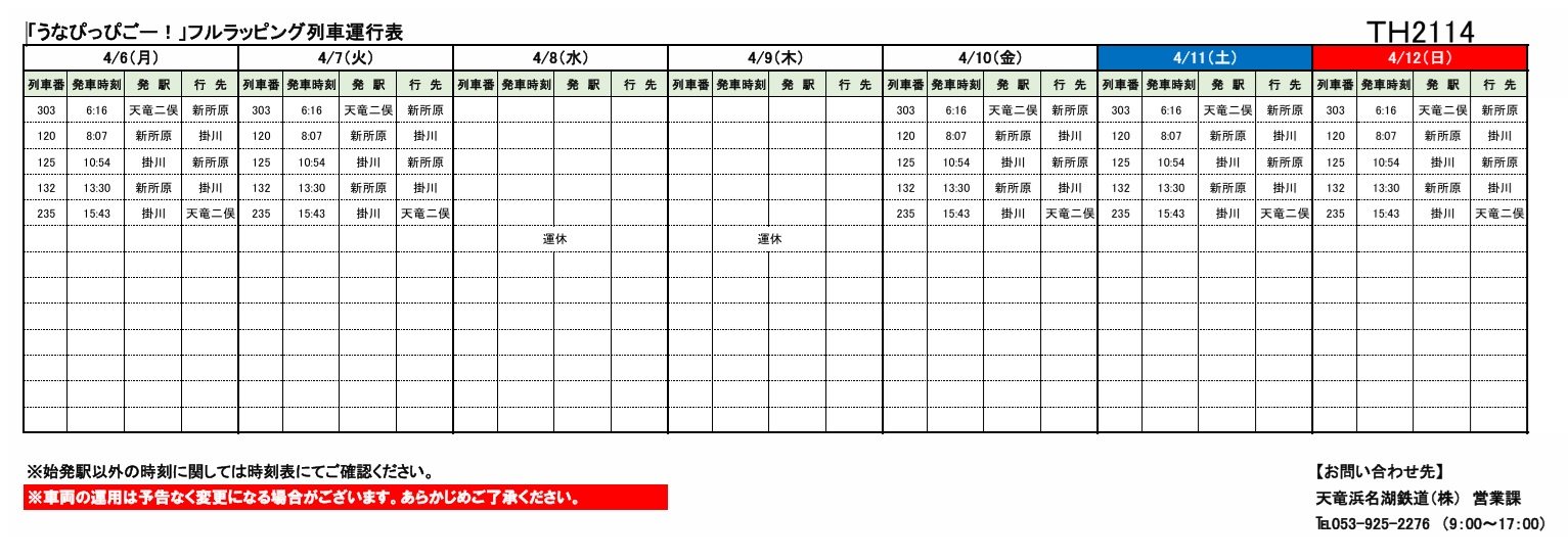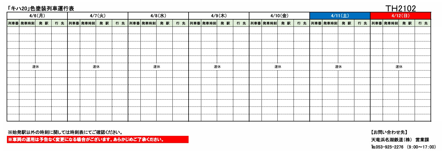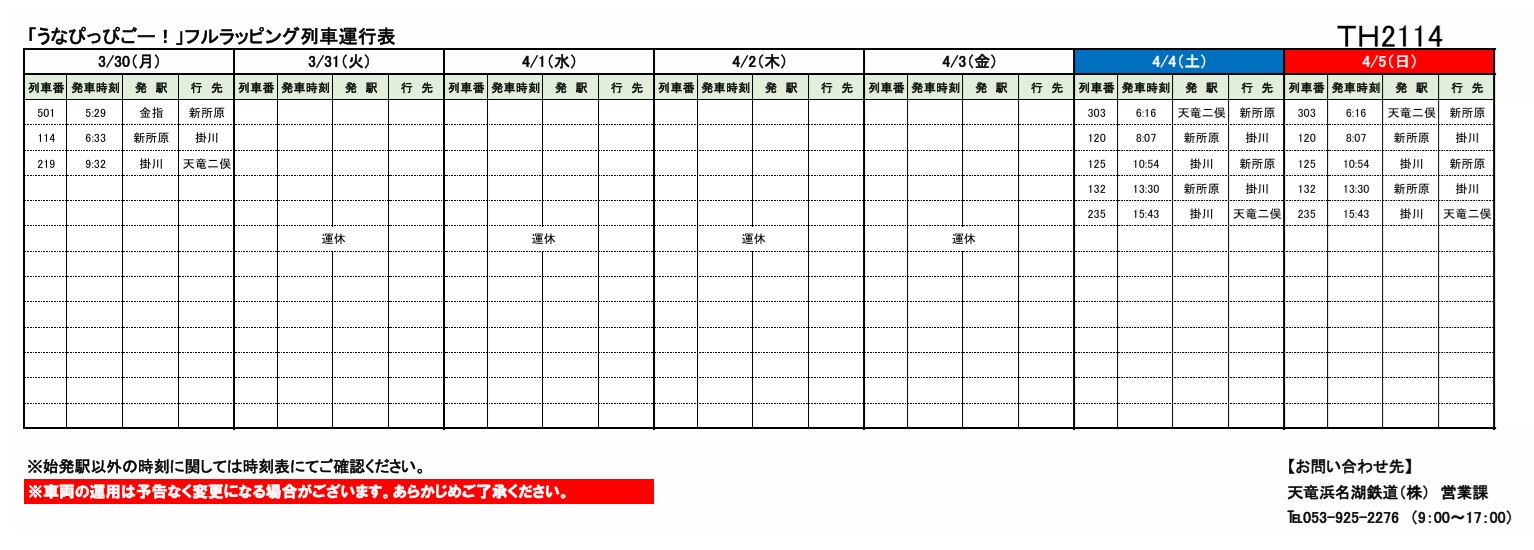 現在、天浜線で運行しているラッピング車両とキハ20色塗装列車等の運行情報を最大2週間先までご案内いたします。各種車両の紹介は、《車両紹介》からご覧ください。