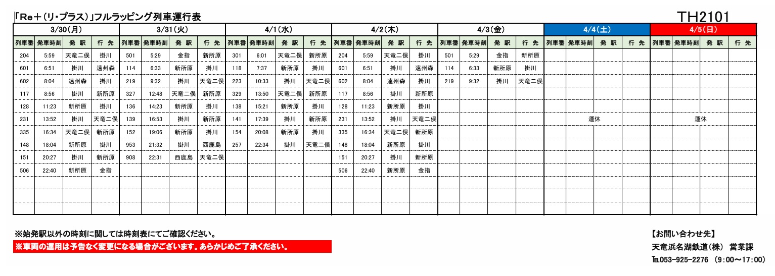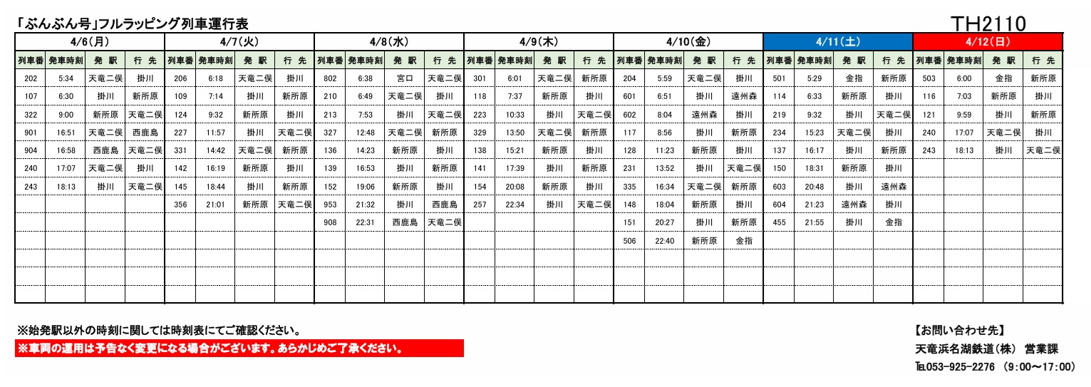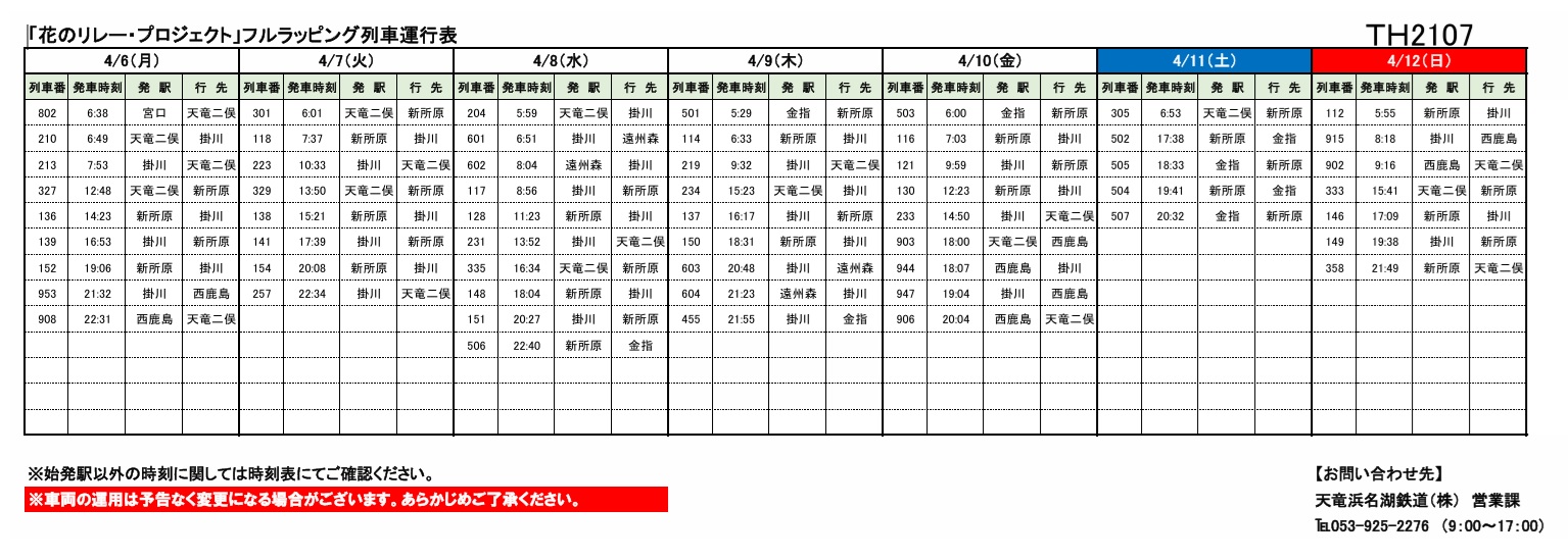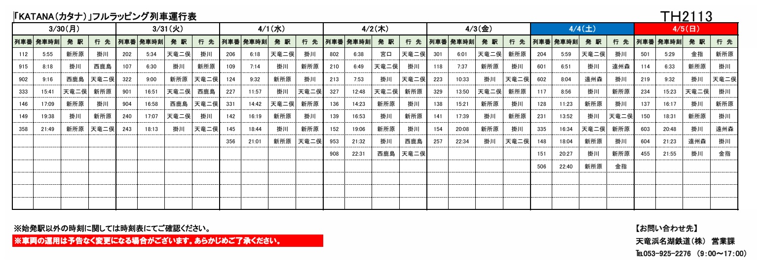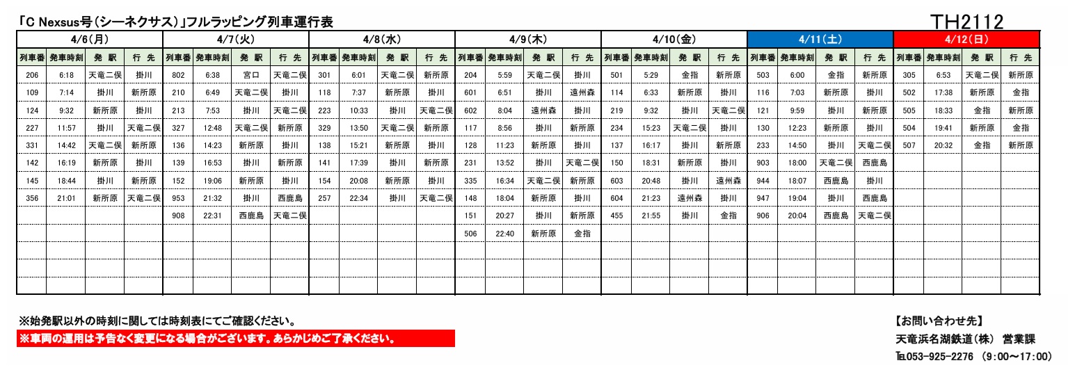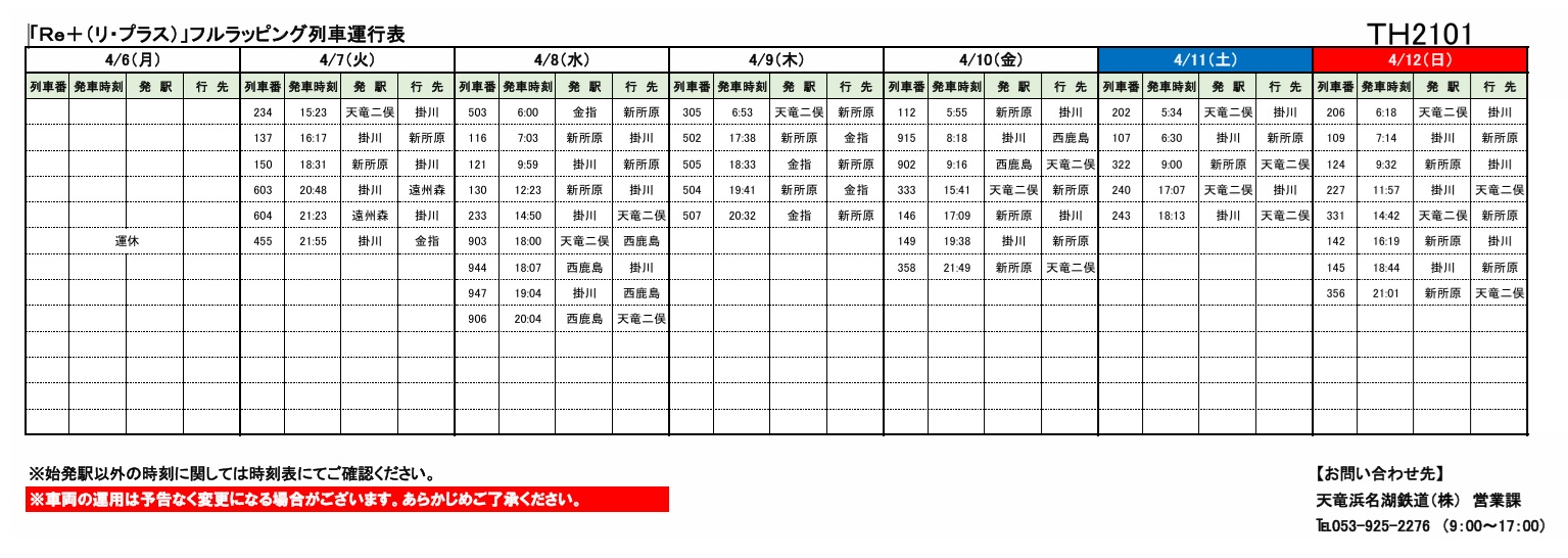現在、天浜線で運行しているラッピング車両とキハ20色塗装列車等の運行情報を最大2週間先までご案内いたします。各種車両の紹介は、《車両紹介》からご覧ください。