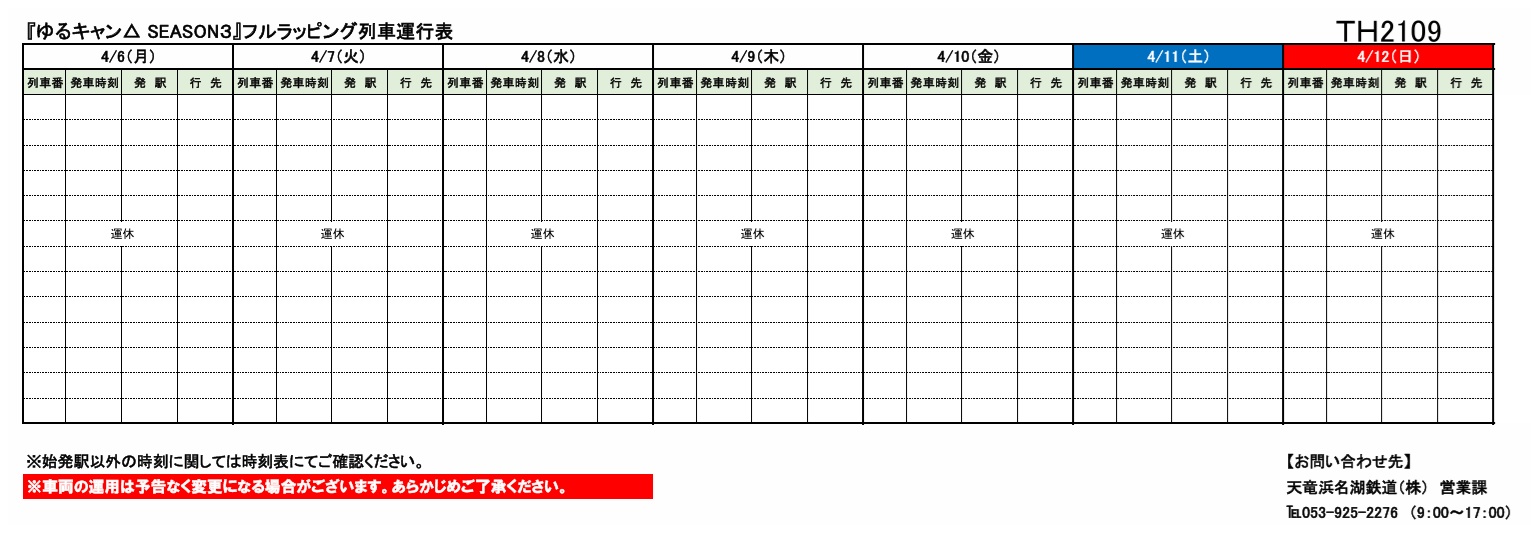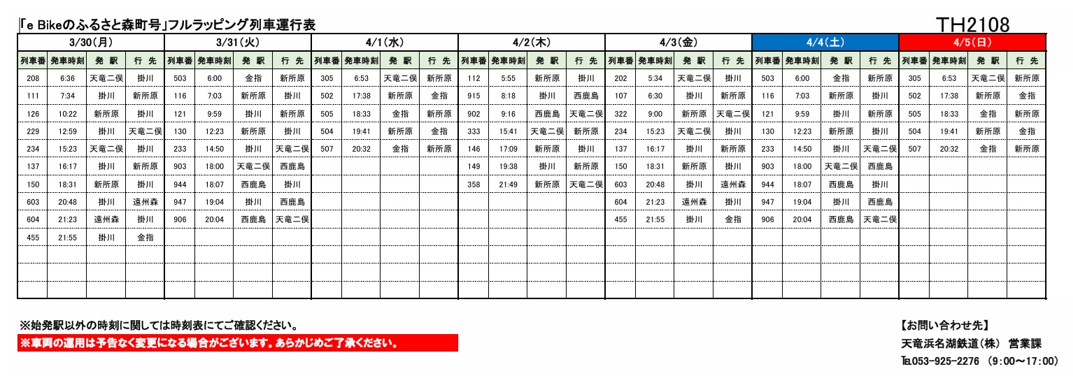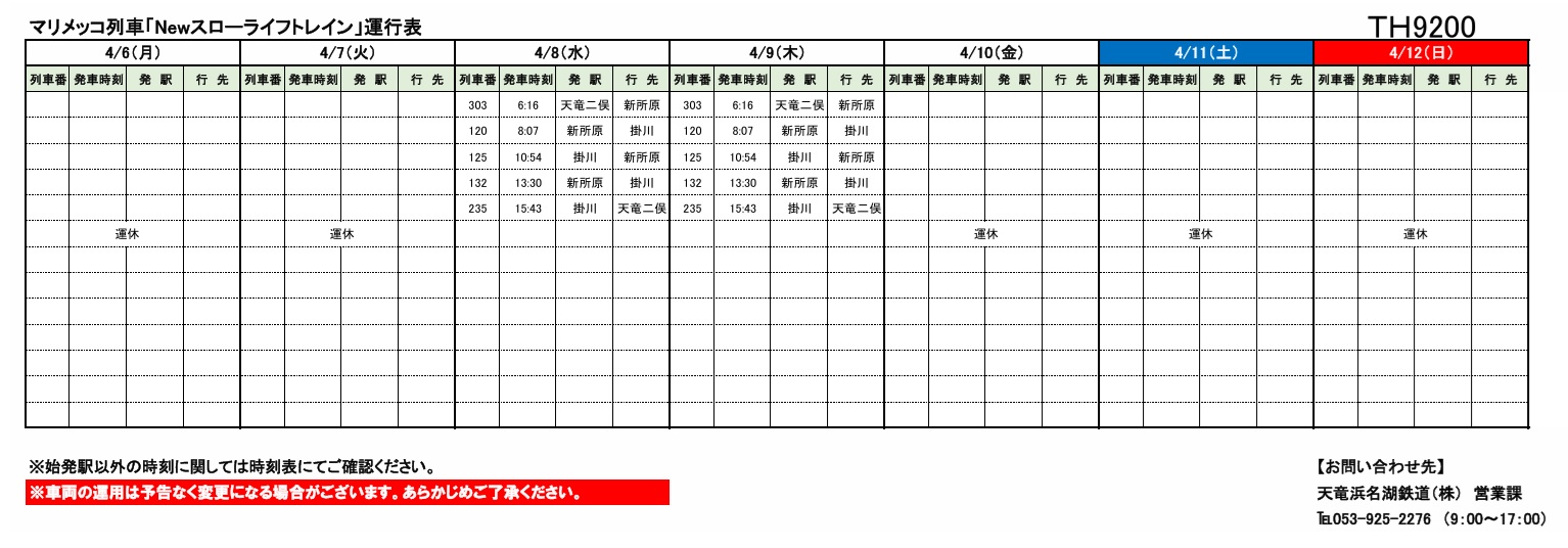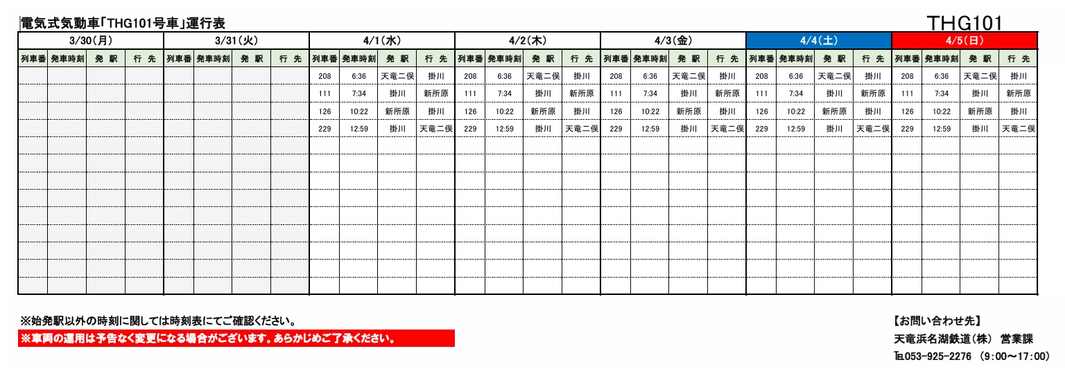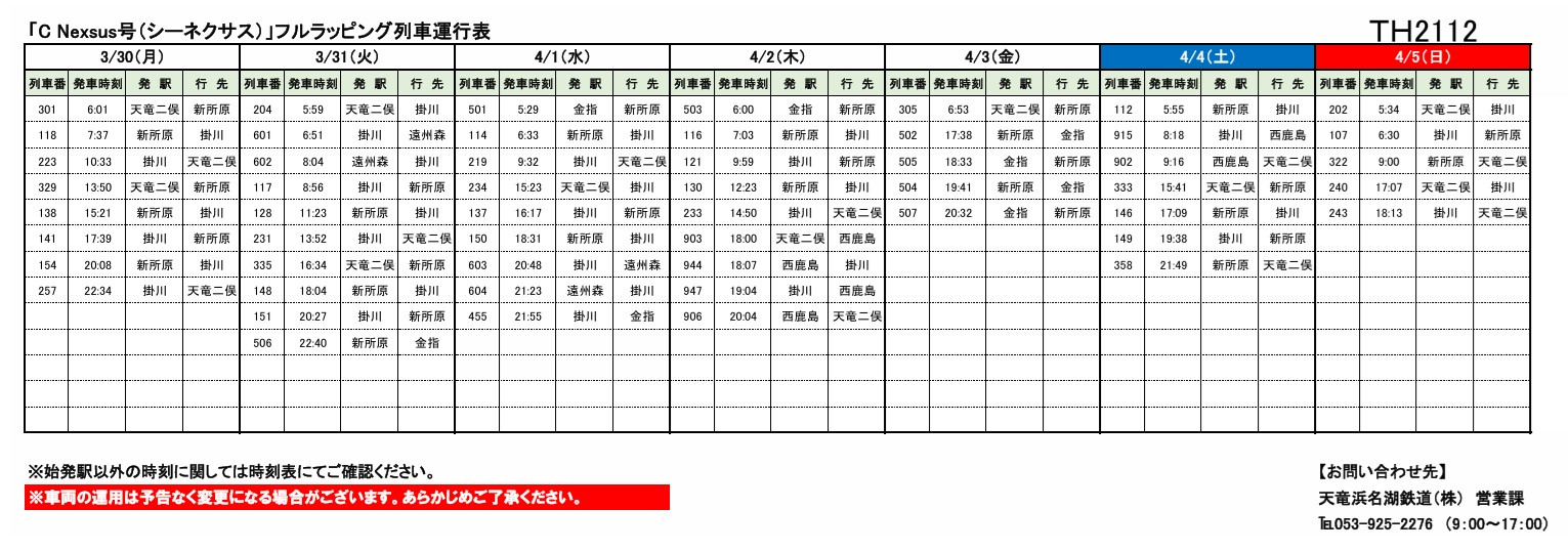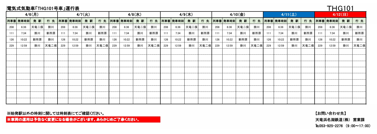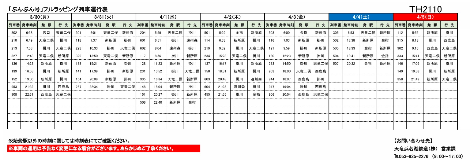 現在、天浜線で運行しているラッピング車両とキハ20色塗装列車等の運行情報を最大2週間先までご案内いたします。各種車両の紹介は、《車両紹介》からご覧ください。