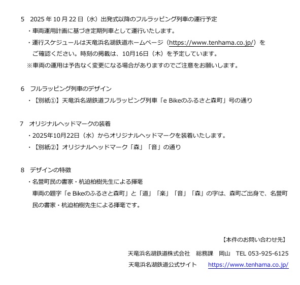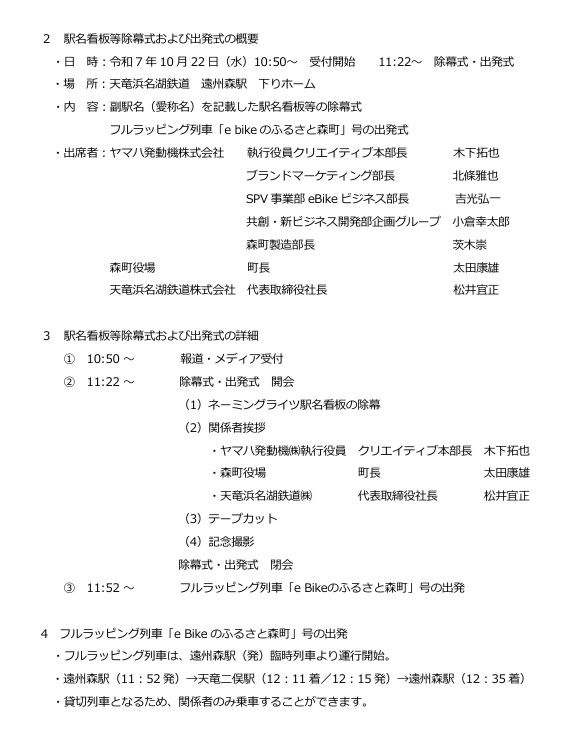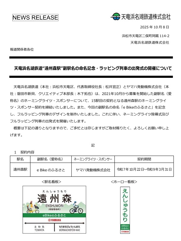 天竜浜名湖鉄道(本社:浜松市天竜区、代表取締役社長:松井宜正)とヤマハ発動機株式会社(本社:磐田市新貝、クリエイティブ本部長:木下拓也)は、2021年10月から募集を開始した副駅名(愛称名)のネーミングライツ・スポンサーについて、15駅目の契約となる遠州森駅のネーミングライツ・スポンサー契約を締結いたしました。また、今回の副駅名の命名「e Bikeのふるさと」を記念し、フルラッピング列車のデザインを制作いたしました。これに伴い、ネーミングライツ除幕式及びフルラッピング列車の出発式を開催いたします。