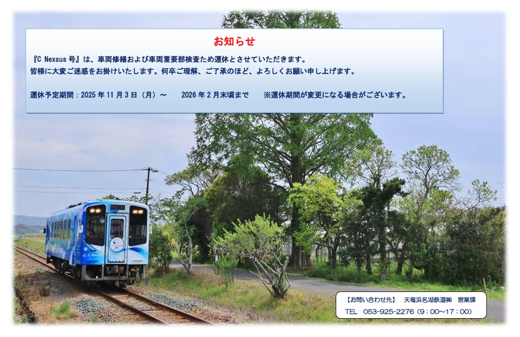2025年11月3日(月)から車両修繕および車両重要部検査のためC Nexsus㈱「C Nexsus号」の運行を休止させていただきます。運行再開日につきましては、整備状況により変更となる場合がございますので、確実に決定次第お知らせいたします。今後も変わらぬご愛顧賜りますようお願い申し上げます。