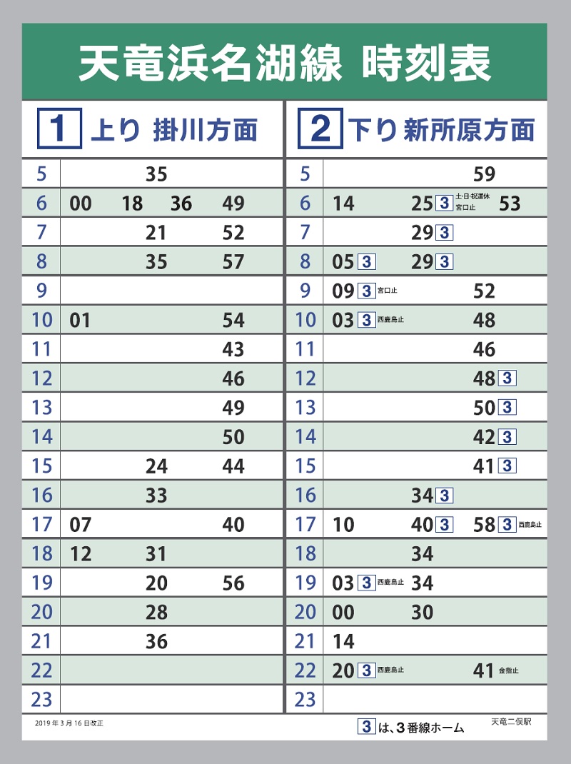 天竜浜名湖鉄道の本社がある駅です。構内には、 国の登録有形文化財に登録された転車台や扇形車庫・運転指令室等の施設が 立ち並び、ノスタルジックなムードを醸し出しています。平日は通勤・通学の乗客で賑わい、土日・祭日には北遠地方(龍山町・佐久間町・水窪町)でハイキングを楽しむグループ、家族連れが多く訪れます。駅舎内にはラーメン店『ホームラン軒』が営業しています。地名の二俣は道の二股ではなく、天竜川と阿多古川の二股のデルタ地帯を意味しています。