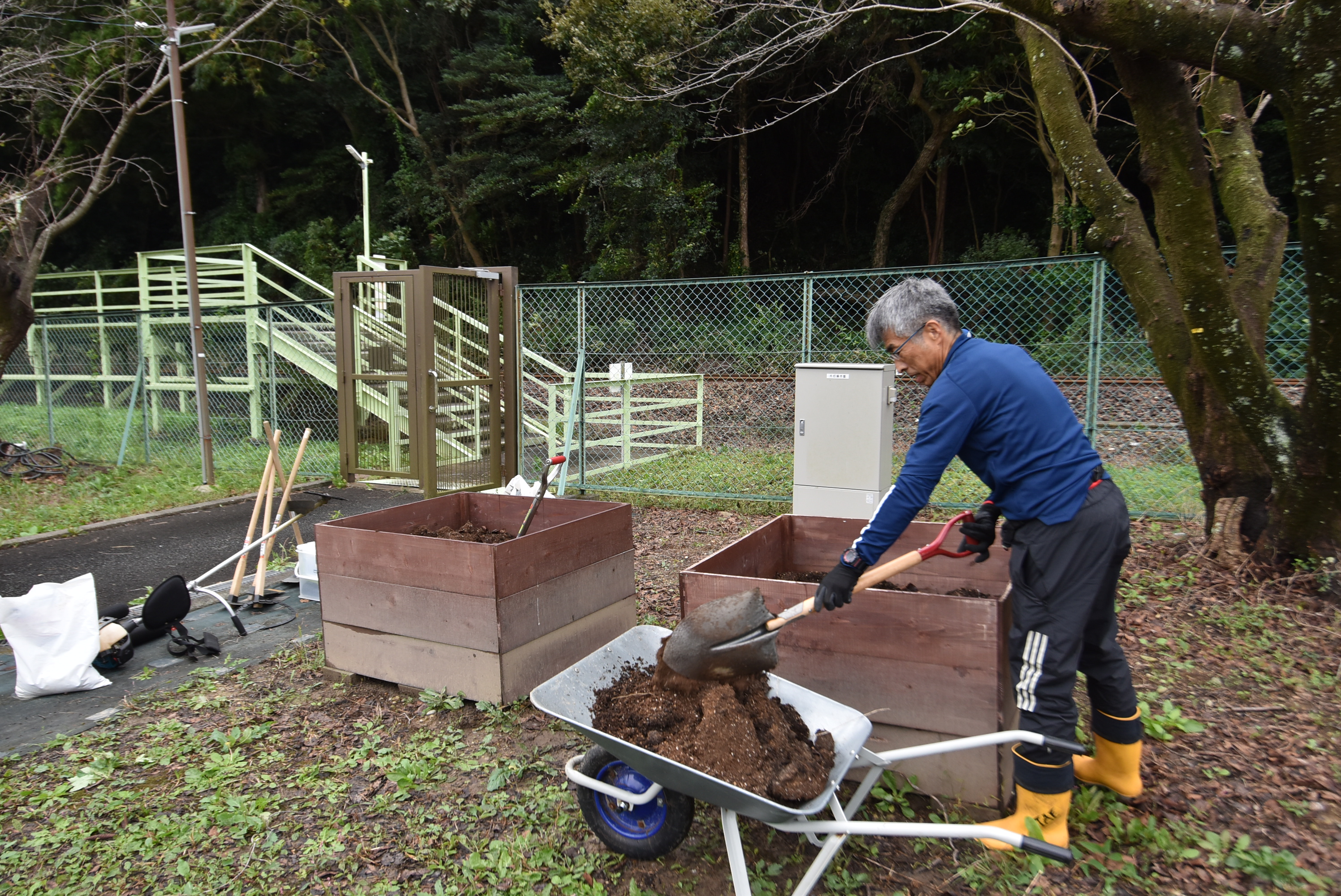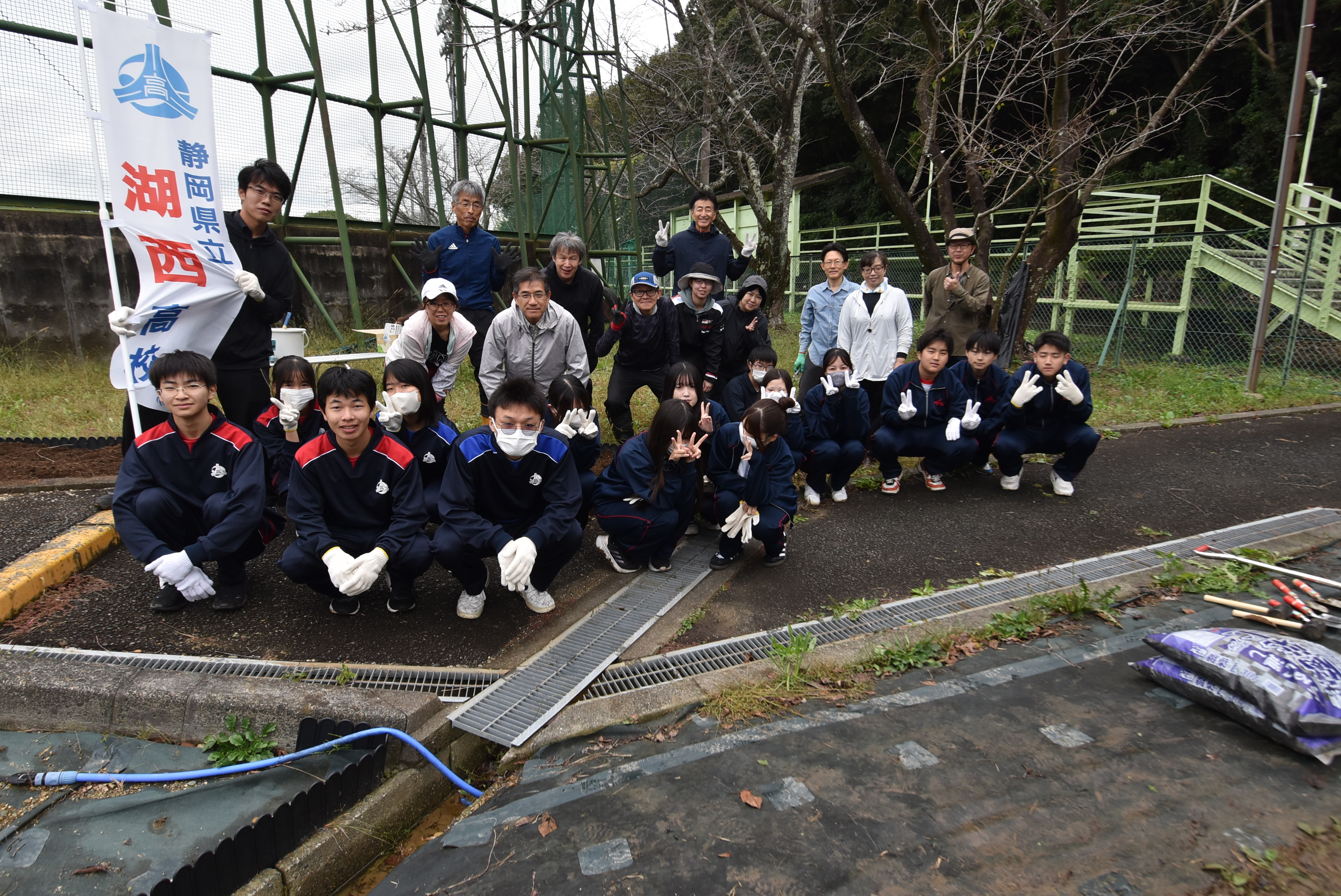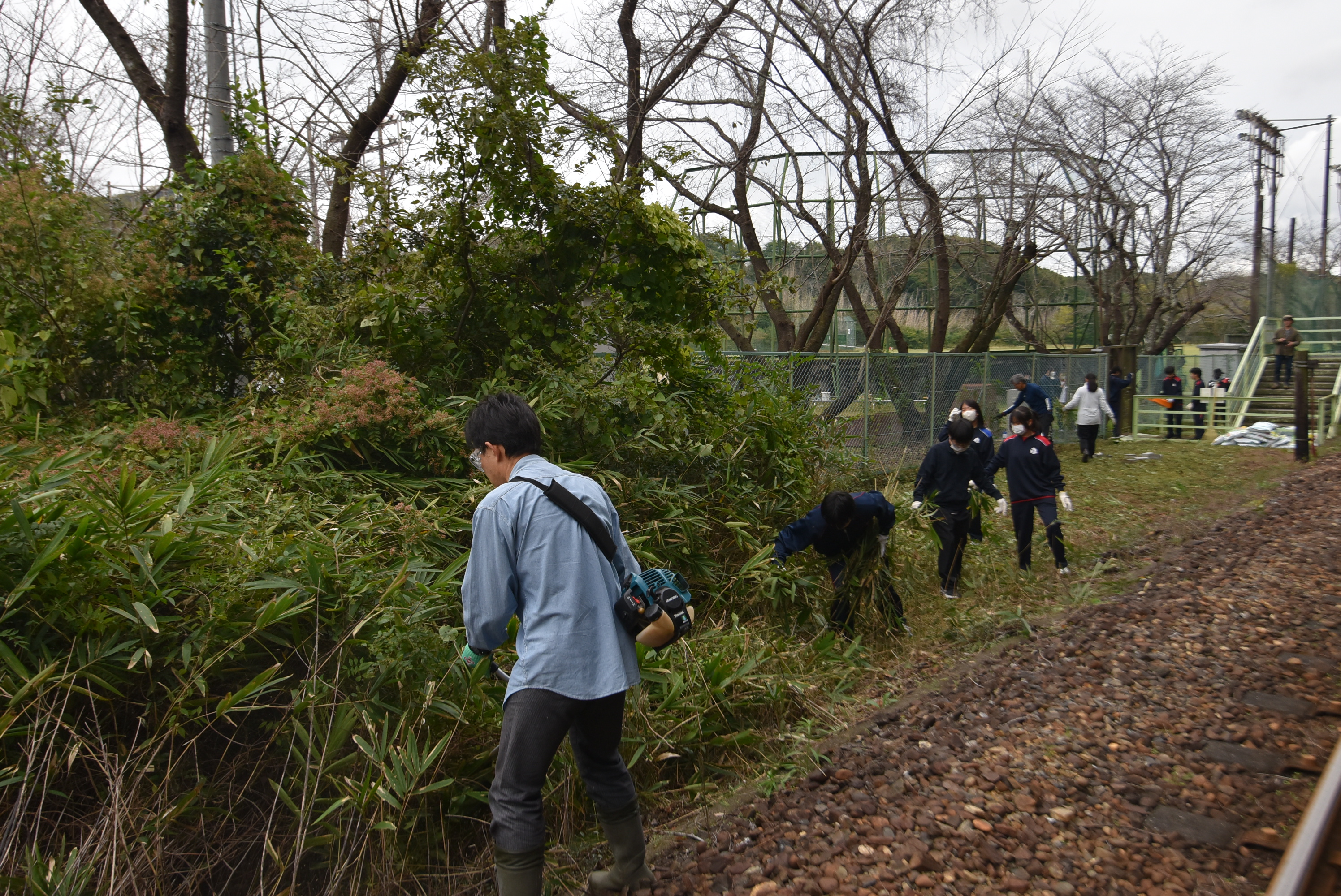 コメント:雨模様の中、ユキヤナギ周辺の草を刈ってくださいました。ユキヤナギに日が当たり、春には真っ白なラインが出現。皆さん、ありがとうございました。