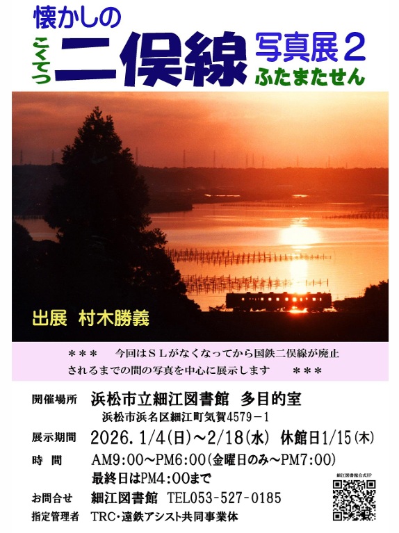 浜松市立細江図書館の多目的室にて、天竜浜名湖鉄道の前身である『懐かしの二俣線 写真展2』を開催いたします。是非、この機会にご来館ください。