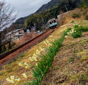 コメント:桜で有名な気賀駅ですが、菜の花とスイセンが、桜より一足先に咲いています。花たちが、皆さんの笑顔をお待ちしています。